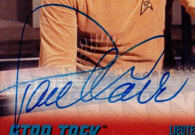 Hello all! I'm James from apieceoftheaction.net! If you're here, you are probably a Trekkie like me. Congrats on having good taste! I've been a fan of Classic Star Trek (and it's varied memorabilia) for years. One of my favorite things to collect? Autographs! Autograph collecting can be quite a task, what with all the fakes out there, so I am putting together this site to offer fellow collectors a good reference for legit signatures of the cast and crew. In most cases, these autographs are found on trading cards offered by Skybox and Rittenhouse Archives, which guarantees their authenticity. In the cases where an actor hasn't signed a card or passed away before the advent of autograph cards, the item pictured was acquired from a reputable dealer in the field and is believed to be authentic.