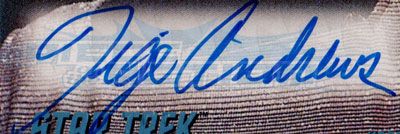 Hello all! I'm James from apieceoftheaction.net! If you're here, you are probably a Trekkie like me. Congrats on having good taste! I've been a fan of Classic Star Trek (and it's varied memorabilia) for years. One of my favorite things to collect? Autographs! Autograph collecting can be quite a task, what with all the fakes out there, so I am putting together this site to offer fellow collectors a good reference for legit signatures of the cast and crew. In most cases, these autographs are found on trading cards offered by Skybox and Rittenhouse Archives, which guarantees their authenticity. In the cases where an actor hasn't signed a card or passed away before the advent of autograph cards, the item pictured was acquired from a reputable dealer in the field and is believed to be authentic.