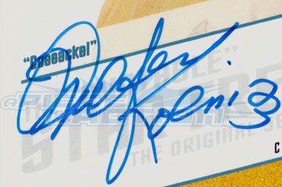 Hello all! I'm James from apieceoftheaction.net! If you're here, you are probably a Trekkie like me. Congrats on having good taste! I've been a fan of Classic Star Trek (and it's varied memorabilia) for years. One of my favorite things to collect? Autographs! Autograph collecting can be quite a task, what with all the fakes out there, so I am putting together this site to offer fellow collectors a good reference for legit signatures of the cast and crew. In most cases, these autographs are found on trading cards offered by Skybox and Rittenhouse Archives, which guarantees their authenticity. In the cases where an actor hasn't signed a card or passed away before the advent of autograph cards, the item pictured was acquired from a reputable dealer in the field and is believed to be authentic.